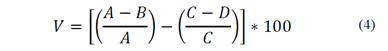 where: V is the volatile-matter content, A is the sample mass at the beginning, B is the sample mass after its homogenization in the mill, C is the sample mass before drying in the muffle furnace, and D is the sample mass after drying in the muffle furnace.