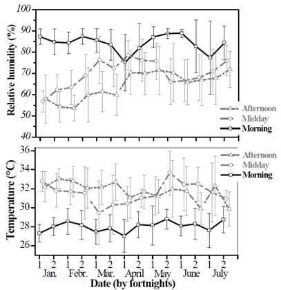 It can be observed that dry season occurs between January and February, with some rainy days since April to July. As expected, relative humidity at midday and afternoon were related to rainfall and sun hours per day. Rainfall reached the highest values among all the measures during the second fortnight of May. It is important to notice that relative humidity was generally higher at morning, when tapping was carried out.