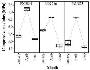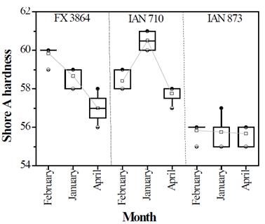 ANOVA demonstrated that hardness varied over the time for FX 3864 and IAN 873 clones. No variation in hardness was observed over the time for IAN 710 compounds. Compounds based on IAN 710 NR showed the lowest values of hardness, but for FX 3864 and IAN 873 compounds the hardness varied even in a same month.