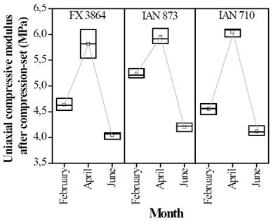 Uniaxial compressive moduli for specimens cured according to rheometric tests are reported in Fig. 13. Compounds based on tapped NR in April showed the highest values of compressive moduli for the three clones. For the other test conditions, some differences in compressive moduli were observed over the time and among clones. Compression-set for specimens cured according to rheometric tests are reported in Fig. 14. The best compression-set values were presented during April for the three clones. IAN 710 compounds showed the worst compression-set of the three clones. Uniaxial compression tests after compression-set were carried out for comparing the resistance to change the mechanical properties under the effect of time and temperature.