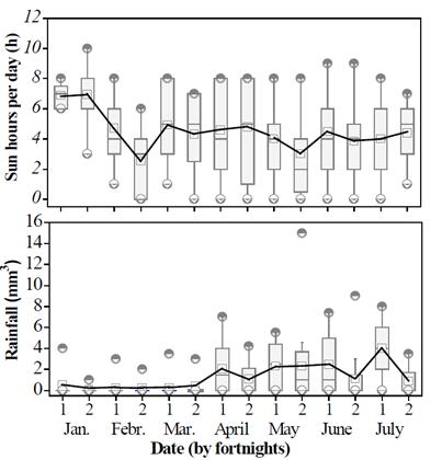 Rainfall, environmental temperature, relative humidity, and sunlight hours at plantation were daily registered during the study.