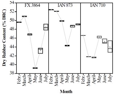 The highest TSC and DRC occur in February-March period and the lowest values occur in May for IAN 873 and FX 3864 clones. For IAN 710 clone, the highest TSC and DRC occur only in February and the lowest values occur in April. Lower values of the percentage of DRC and TSC generally match the few sun hours, high rainfall and relative humidity at midday and afternoon. This agrees with the description in several studies of Moreno et al. [4, 6]. DRC and TSC values are related to a decrease in the biosynthesis of the rubber tree between January and February when the foliation and flowering senescence begin. It is significant to notice that DRC and TSC for the three clonal varieties studied in this work are above the average values that are reported in literature [4-8].