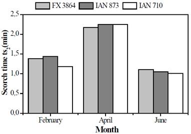 Figs. 8 and 9 show the variation in processing times according to rheometric tests. Compounds with NR tapped in April showed the highest processing times for the three clonal series. Differences in t90 and scorch time of clones could be related to changes in rubber plasticity and viscosity, due to the fact that of NR particles in latex are surrounded by a complex mixture of proteins, lipids, and fatty acids that can form long chains and interact with elastomer chains [16].