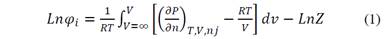 In Equation 1, Z is the compressibility factor; the derivative part represents the partial derivative of component i keeping the temperature, volume, and the moles of the other components constant.