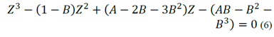 The previous equation needs the gas or liquid phase compressibility factor, which is obtained from the PR-EOS cubic expression (Equation 6; [2]). In Equation 6 A is equal to amP /R2T2 and B is equal to bmP/RT.