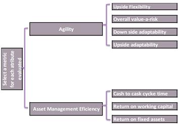 According to the Agility criterion (see Figure 2) only one level 1 metric must be picked from the 4 alternatives available. Likewise, according to the Efficient Management of Assets criterion, a level 1 metric must be picked from the 3 alternatives available.