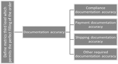 After defining the metric that will measure reliability (See Figure 3) based on the perfect order fulfillment criterion, it becomes the objective; the criterion corresponds to the selected metric and the alternatives will be the level 3 associated indicators. As an example, if documentation accuracy is defined as the metric to consider, the decision tree will look as follows: