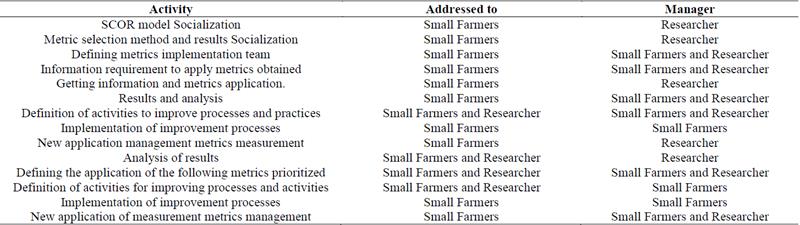 This work plan (see Table 18) must systematize the application of the metrics in such a way that the priorities in the AHP are gradually covered and therefore improve the management of the chain over time. This suggests that small producers and other actors of the chain must participate decisively, most likely through several years, as required by the process of intervention.