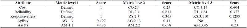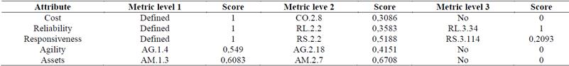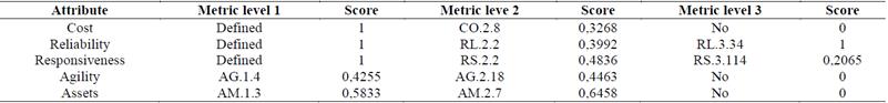 In order to begin the application of the methodology, it is important to specify that the attributes of the SCOR will not be revised, and that this study will only focus on the metrics for each level. Given that the SCOR version 11 revises some metrics, it may be found that for some attributes where the SCOR model assesses the management of the supply chain, the metrics have been reduced to only one in the level I or strategic, which is why applying the tools for metrics selection is not necessary. Specifically, in order to measure the attributes of Reliability, Responsiveness and Cost they will not be subject to analysis in the first level of decision, leaving the metrics for the attributes of Agility and Asset Management Efficiency as the ones to be analyzed in the first level of the metrics structure. For the following levels 2 and 3 the metrics are multiple, therefore, the decision process on the metrics to be used will be completely pertinent.