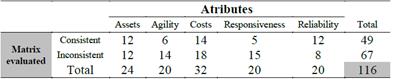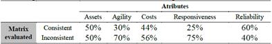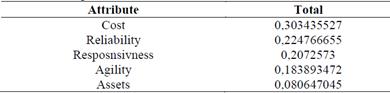 Given: A set of attributes i ={1, 2...,5}, where i= Reliability, Responsiveness, Agility, Cost y Asset management efficiency.