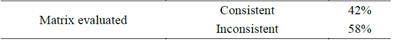 Table 2 shows the total matrices appraised for each attribute as well as the total matrices for the issue at hand. Likewise, we can observe the amount of inconsistent and consistent matrices respectively. From the above, we will generate the percentages of consistencies and inconsistencies per attribute and totals on Tables 3 and 4, from the information gathered from the experts.