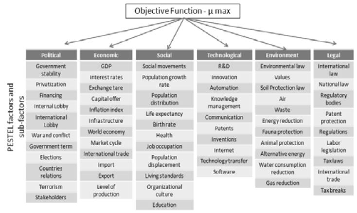 As demonstrated in item 2, the PESTEL tool does not offer predetermined subdivisions. In this case, in order to validate the method, we found support on the Doctoral Thesis by [8] which, validating criteria inherent to the oil industry supply chain, used the following sub-factors (subdivisions) PESTEL, Fig. 1.