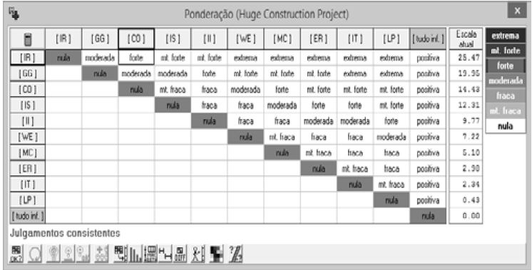 As a way of fomenting new studies, it is proposed the generation of final matrices from a group of specialists involved in large construction projects and use the results as a panel in a wide debate aiming at creating some kind of "key factors" or "crucial weighting" for this type of project. In this case, of course, it will be necessary to develop sample selection methods thorough enough, as well as relativize the results obtained for the site where the study shall take place, as well as for a specific time period.