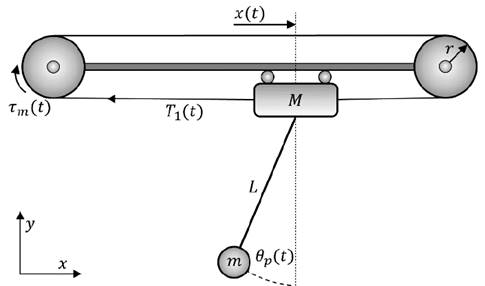 El modelo estudiado describe la posición angular de la carga θp(t) en radianes respecto al eje vertical que acompaña a la carretilla. La carretilla es halada por una tensión T1 a lo largo de un soporte, generando un desplazamiento lineal x(t)
