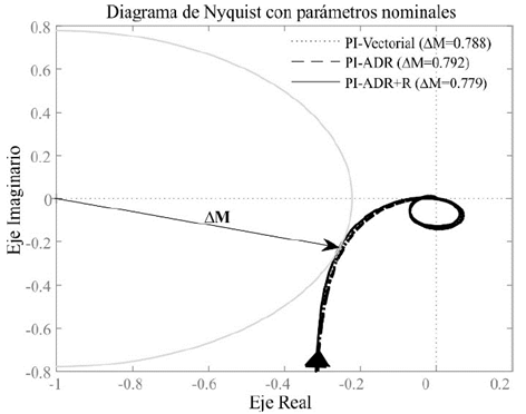 Las gráficas de Nyquist son utilizadas para analizar y evaluar la robustez de los sistemas de control. La distancia mínima entre la curva de Nyquist y el punto [-1,0j] define el margen de módulo Δ𝑀, e identifica la robustez del sistema de control. Un sistema robusto debe tener un margen de módulo superior o igual a 0.5 [20]. La Fig. 3 detalla el margen de módulo de las curvas de Nyquist de lazo abierto de cada sistema de control: PI-Vectorial, PI-ADR y la propuesta de control etiquetada como PI-ADR+R.