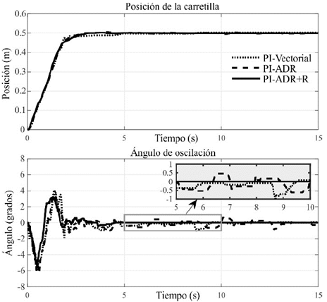Adicionalmente, la Fig. 11 muestra que el desempeño del esquema PI-ADR se ve afectado (dada la incertidumbre del sistema), mostrando gran cantidad de variaciones en el ángulo de oscilación de la carga y en el posicionamiento de la carretilla. Esto muestra que el aniquilador propuesto en ec. (29) proporciona mejores resultados que el modelo interno convencional usado en esquemas clásicos ADRC como el mostrado en la sección 4.