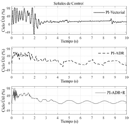 La Tabla 4 muestra el resumen de los índices de desempeño encontrados. Para facilitar el análisis de la tabla, los índices de desempeño se ponderan en términos porcentuales relativos a los obtenidos por el esquema de control propuesto (PI-ADR+R). Así entonces, se puede notar que en los tres casos experimentales, la estrategia de control propuesta tiene mejor desempeño en términos de atenuación de oscilaciones en la carga y además se logra usando menor cantidad de energía de control.
