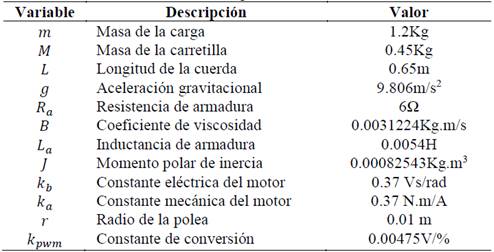 kpwm es la constante de conversión de ciclo útil a voltaje aplicado al motor, y 𝑢(𝑡) es la entrada de control que representa ciclo útil. La Tabla 1 muestra los parámetros del modelo de la grúa-torre.