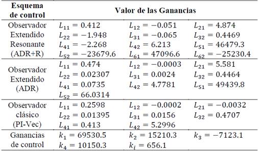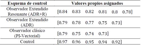 La Tabla 2 muestra los valores propios seleccionados para cada esquema de control/observador, y la Tabla 3 muestra las ganancias obtenidas en cada caso. De aquí en adelante el esquema de control propuesto en la sección 3 es etiquetado como (PI-ADR+R).