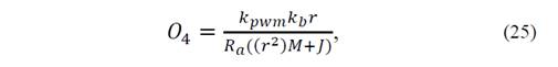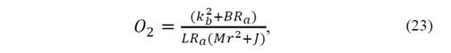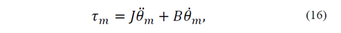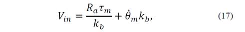 donde 𝐽 representa el momento inercia del eje del motor, B es el coeficiente de viscosidad del motor, kb constante mecánica del motor, θm representa la velocidad angular del motor, Vin es el voltaje aplicado en terminales del motor y τm el par del motor. Además, las ec. (14)-(15) están linealmente relacionadas con las ec. (16)-(17), mediante: