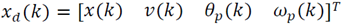 es el vector de estados en tiempo discreto del sistema, v(k) es la velocidad lineal de la carretilla, ωp(k) es la velocidad angular del péndulo, y