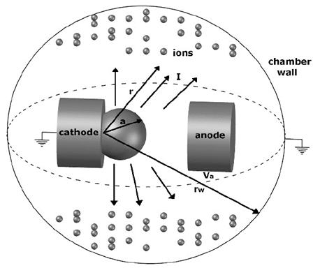 This approximation is suitable because the plasma flux and energy expansion is relatively symmetric. This effect can be approximated by the cosine distribution 𝑛~ 𝑐𝑜𝑠 ∝ 𝜃. In our case α→0, then a spherical distribution is obtained, and it is in agreement with experimental results using a cylindrical anode with the cathode placed at the center of symmetry [18]; furthermore, the angular dependence on the ion flux is neglected [9].