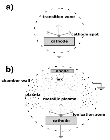 The model developed by Kelly et al. is applied in systems where multiple spots are produced and influence the cathode erosion. In most cases, arcs that operate at low current have as a principal source a single cathode spot; this produces a plasma jet of high velocity that is directed toward regions far from the cathode [11]. As the current is increased, other cathode spots appear in a proportional way. If there are multiple spots randomly distributed on the cathode surface, a plasma jet emerges forming a region of plasma that fairly fills the whole interelectrode space [12].