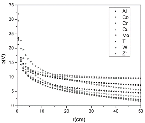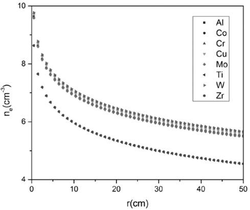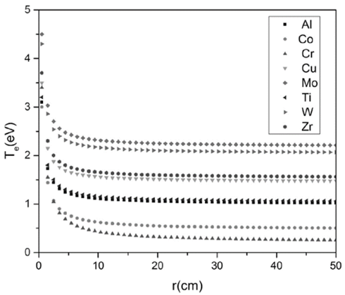 In Fig. 4, the behavior of the electron temperature as a function of the radius is presented. The different trends are due to the different values of the electron temperature of each cathode material, which is taken as an initial condition for solving the differential equations. A typical characteristic of these curves is the trend to decrease as function of the radius in the interval 0<𝑟<10 𝑐𝑚. For 𝑟>10 𝑐𝑚, the curve trends to remain constant; furthermore, the magnitude of electron temperature for each material is approximately of 2 𝑒𝑉.