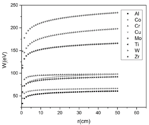 In Fig. 6, the profile of 𝑊 𝑖 , as a function of the radius is presented. The behavior of 𝑊 𝑖 is mainly governed by the values of velocity and ionic mass, 𝑊 𝑖 ∝ 𝑣 𝑖 2 𝑚 𝑖 , which are summarizing in Table 2. In this figure, a greater increase in the kinetic energy is observed between 0<𝑟<25 𝑐𝑚, reaching a stable value for 𝑟>25 𝑐𝑚; nevertheless, it is important to note that for the heaviest metals, it is more difficult to find the stability. This is because the conditions of high energy do not allow to reach the equilibrium state in contrast to the case of materials with lower values of ion mass and initial velocity. For instance, taking as reference the materials with the greatest and the lowest kinetic energies, Mo and Al respectively, it is observed that there is a great difference between them, in the order of 4.6 𝑒𝑉; therefore, it is possible to conclude that materials with greater mass requires to travel greater distances for exchanging or transferring energy as the radius is increased. Other important aspect to consider is the electric potential; it is observed that for materials with greater average charge and electron density, there is an important increase in 𝑊 𝑖 , producing an extra acceleration of ions emitted from the cathode spots. In energetic considerations, this increase in the acceleration makes it difficult to find the equilibrium point at regions far from the emission sites.