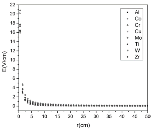In Fig. 7, the electric field as function of the radius is presented. Initially, for values of 𝑟≤𝑎, there is an electric field different from zero that is generated due to a transition of the plasma from non-equilibrium close to the emission sites toward the equilibrium state, at sites far from the cathode spots. These tendencies in the electric field are similar for all the materials, regardless the ion mass, the electric potential, the initial ionic velocity, the electron temperature and the electron density. The fact that 𝐸=0 𝑉/𝑚 ensures the consistency of the model considered, because when the value of the plasma conductivity is high, the electric field tends to very smaller values.