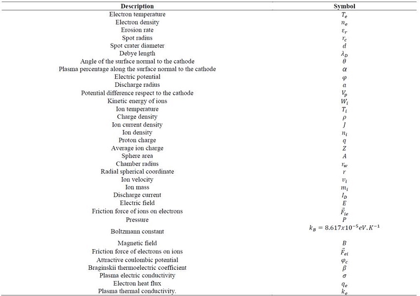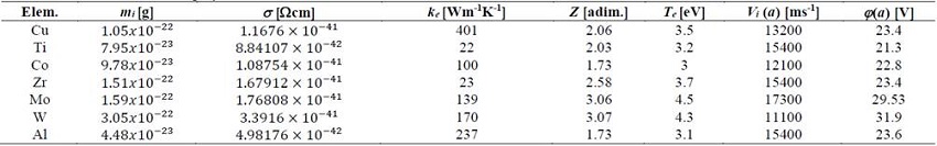 In Table 2, values for physical constants for the different materials used in this work are listed; these values were experimentally found by Anders [19]. The discharge current and radius were taken as 𝐼 𝐷 =10 𝐴 and 𝑎=0.5 𝑐𝑚, respectively.