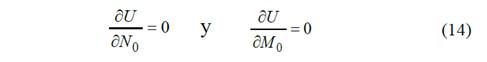 Derivando parcialmente esta función con respecto a N0 y M0 como se describe en la Ec. 14 y simultaneando las ecuaciones obtenidas con la Ec. 20 se obtiene