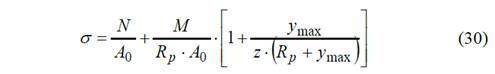 Con estos parámetros se pueden determinar las tensiones σ a medida que se varía el ángulo φ en una sección cualquiera S de la llanta, bajo la acción de una fuerza normal N y el momento flector M que también es función del ángulo φ.
