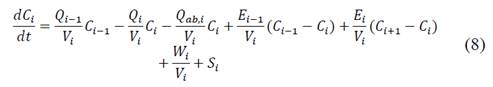 Donde, C i es la concentración del contaminante; Q i es el flujo en el iésimo segmento; Q ab es la salida en el elemento i debido a extracción puntual o difusa; Vi: Volumen incremental del iésimo segmento; t es el tiempo; S i son las fuentes y sumideros del constituyente debido a reacciones y mecanismos de transferencia de masa; E i es el coeficiente de dispersión longitudinal entre segmentos i y i+1; y, W i es la carga externa del constituyente en el elemento i.