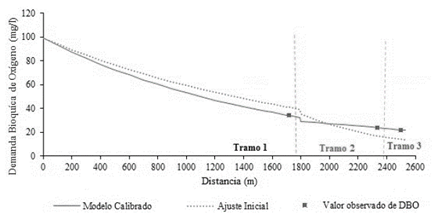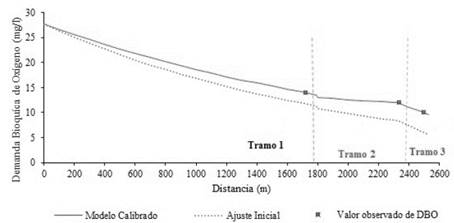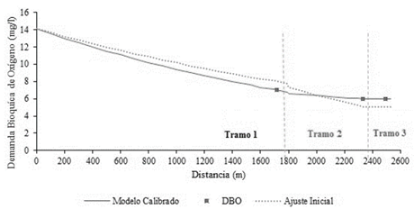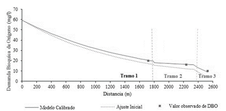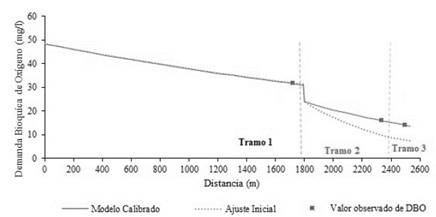 El perfil de la DBO presenta una tendencia descendente a medida que la corriente avanza, a lo largo de los tramos modelizados, como consecuencia de los valores altos de la constante de remoción total de la DBO. No obstante, las curvas evidencian mayores niveles de DBO en el primer tramo en los meses de la época seca, principalmente noviembre (DBO inicial mayor a 100 mg/l), con respecto a los meses de la temporada lluviosa. Esta variación se explica en términos de la influencia del incremento considerable del caudal por las precipitaciones y la consecuente dilución mayor de la materia orgánica [17].