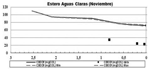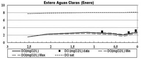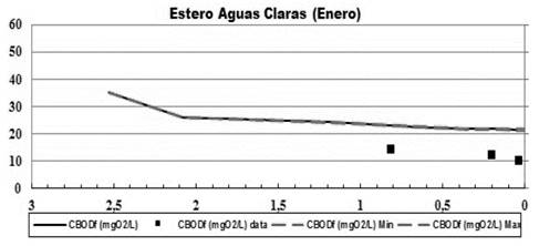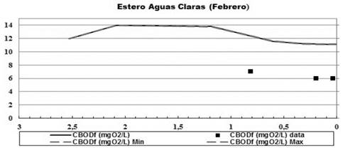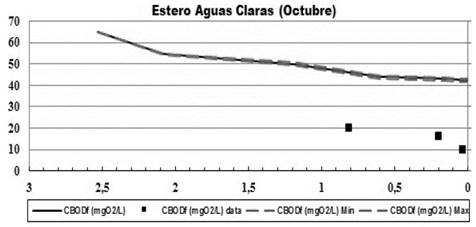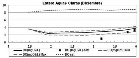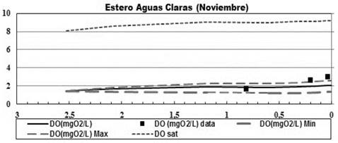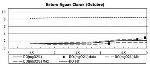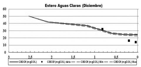 Mediante el programa de calidad de agua superficial QUAL2K, versión 2.12, desarrollado por las USEPA (Agencia de Protección Ambiental de los Estados Unidos), se obtuvieron curvas que simulan la variación del oxígeno disuelto y la demanda bioquímica de oxígeno a lo largo de la corriente del estero Aguas Claras.