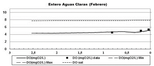 Los perfiles de oxígeno disuelto en los meses de la época seca mostraron la forma característica del perfil de oxígeno disuelto a lo largo del primer tramo, incluyendo un segmento de condiciones anaeróbicas de 500 m de longitud, como resultado del aporte de materia orgánica procedente de la descarga de aguas servidas en la parroquia 24 de mayo, que desploma la concentración de oxígeno disuelto por debajo del estándar ambiental (<80% de saturación), y que afecta el desarrollo de la vida acuática en el estero [16]. En los tramos dos y tres, la tendencia de recuperación de los valores de oxígeno disuelto se acentúa. Por el contrario, en los meses de la época lluviosa (enero y febrero), los perfiles describen un incremento sostenido del oxígeno disuelto en el tramo uno, desde su valor mínimo que ocurre en la descarga puntual; esto se debe al aumento de la tasa de reaireación promovida por las precipitaciones; sin embargo, en el segundo tramo, se produce un descenso del oxígeno disuelto a partir de la desembocadura del riachuelo del sector 17 de Marzo, que se explica por el mayor arrastre superficial de partículas y materia orgánica causado por el incremento del caudal en temporada de lluvias, incluyendo el incremento de la profundidad del cauce en el mencionado tramo. El tramo tres describe una recuperación del oxígeno disuelto, básicamente por ser el menos profundo y de mayor caudal y turbulencia mecánica [17].