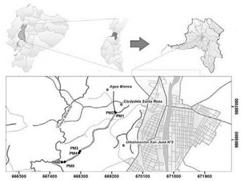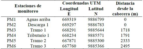 Simultáneamente a los aforos, se recolectaron muestras de agua en los seis puntos de muestreo identificados en la Tabla 2, considerando los criterios establecidos por las normas INEN 2176:1998, e INEN 2226:2000, sobre manejo y conservación de muestras, y técnicas de muestreo de aguas, respectivamente [4] [5].