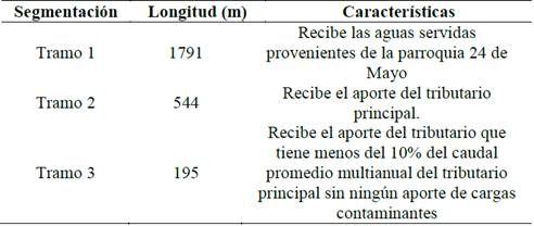 Se consideró un segmento de 2,53 km, dividido de acuerdo a sus características hidromorfológicas y la presencia de aportes a la corriente principal, en tres tramos. Se identificaron dos afluentes: en el inicio del primer tramo, una descarga continua de aguas servidas provenientes de los sectores Los Chirijos, Juan de Dios Zarate y Divino Niño, en la parroquia 24 de Mayo; y en el segundo tramo, un riachuelo que se origina en el sector San José Sur.