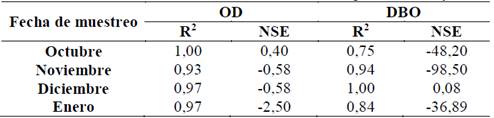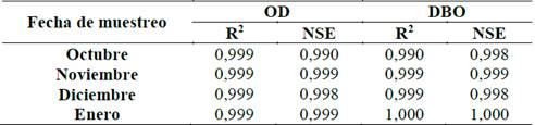 El rendimiento del modelo refleja un ajuste óptimo de los valores medidos, tanto para el oxígeno disuelto como para la DBO, tal como lo indican los valores del índice de eficiencia de Nash-Sutcliffe, y del coeficiente de determinación (Ver Tabla 8).