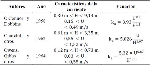 En primera instancia, la constante de reaireación se determinó utilizando las fórmulas empíricas más utilizadas, en función de los rangos de profundidad (H) y velocidad de la corriente (U) [7], Tabla 3.