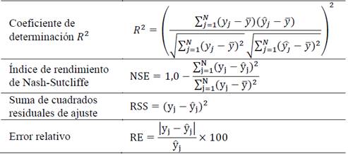 Asimismo, se efectuó el análisis de rendimiento del modelo en la predicción del oxígeno disuelto y la DBO para determinar el error estadístico entre los valores medidos en el campo y los valores pronosticados, mediante el coeficiente de determinación 𝑅 2 , el coeficiente de Nash-Sutcliffe (NSE), la suma de cuadrados del error (RSS, por sus siglas en inglés), y el error relativo [11], Tabla 4.