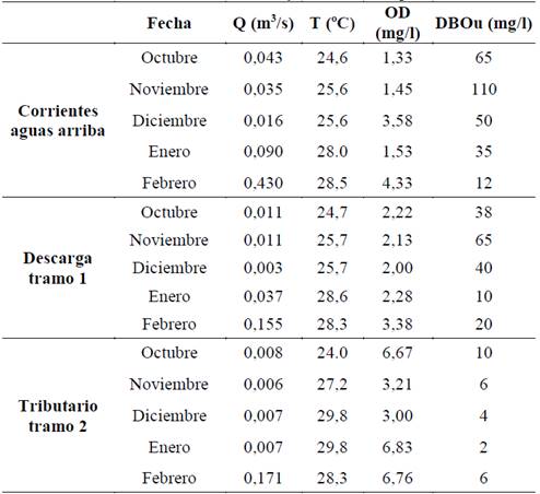 La Tabla 6 muestra los datos de caudal, temperatura, oxígeno disuelto y DBO característicos de los aportantes a la corriente del estero Aguas Claras.
