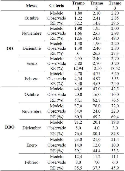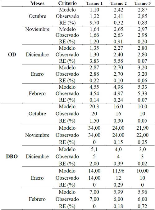 Así, el modelo de Streeter-Phelps, aplicado a partir de las condiciones iniciales resultante del balance de masas realizado con los datos de la Tabla 6, estimó concentraciones mensuales de oxígeno disuelto y DBO, los que se muestran comparativamente en la Tabla 7, con los valores medidos en el laboratorio, incluyendo el error relativo entre ambos.