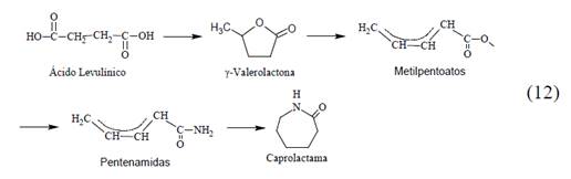 La producción de ADA a través del LA y γ-valerolactona (GVL) da un rendimiento teórico global del 34%, en cuatro pasos. Sin embargo, el bagazo o residuos de alimentos se pueden usar como la materia prima de fermentación para producir el LA con un rendimiento del 83%. Raoufmoghaddam estudia una ruta catalizada desde el LA a la CPL (Ec.12). La transformación de LA en GVL mediante una reacción de hidrogenación tiene un rendimiento alto (>95%). La ruta propuesta procede a través de la destilación reactiva catalizada por ácido de GVL con metanol a una mezcla de metil pentenoatos isoméricos (MP), reacción de MP con amoníaco a las correspondientes pentenamidas, que finalmente se convierten en CPL a través de una reacción de hidroamidometilación intramolecular catalizada con rodio [47].
