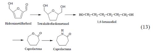 La ruta del HMF al ADA ha sido muy investigada. A partir de fructosa se tiene un rendimiento teórico de ADA hasta del 78%. Sin embargo, estas son materias primas costosas y el margen económico hacia el ADA es pequeño. El HMF obtenido partir de materias primas más baratas proporcionaría márgenes económicos más grandes, promoviendo su viabilidad. Por otro lado, Teddy estudia la conversión catalizada del HMF al 1,6-hexanodiol a través del Tetrahidrofurdiometanol (THFDM), convirtiéndolo luego a caprolactona y finalmente a CPL (Ec.13) [48].