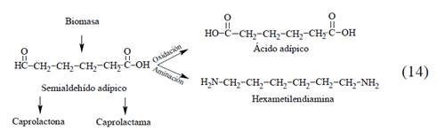 La ruta del SAA es otra combinación de biotecnología y catálisis química. Sin embargo, esta ruta se encuentra en fase inicial. Recientemente, la empresa BioAmber, un pionero en la producción de SA de base biológica, compró la licencia de la ruta de síntesis de Celexion [49] para explorar vías biotecnológicas para producir SAA [50], además, tiene una patente sobre la producción de SAA y otros compuestos orgánicos a partir de microorganismos recombinantes [51]. Este compuesto se puede utilizar como material de partida para producir caprolactona, CPL y HMDA (Ec.14). Por otra parte, su oxidación puede proporcionar una ruta atractiva para ADA [49,50]. Invista también cuenta con una patente sobre la producción de SAA a partir de microorganismos [52].