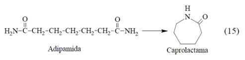 También se observa la valorización de la adipamida, un subproducto común en las reacciones del MA y en la síntesis de CPL. El rendimiento máximo conseguido hasta ahora para la conversión de adipamida a CPL es sólo del 35%. La adipamida se puede obtener del adiponitrilo o a través de la amidificación del ADA. Para convertir directamente adipamida a CPL, Frost y colaboradores utilizan un catalizador 8.6% Pd/Davisil 635 (mol 5.6%) en diglima, a 250 °C (Ec.15) [41].