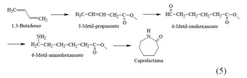 Otro proceso de síntesis de CPL a partir de BD es el de hidroesterificación, desarrollado por BASF [10] y DSM/DuPont [11,12] (Ec.3). Otro proceso similar, implica la hidrocianación como paso clave (Ec.4). El proceso ALTAM de DSM (ALTternativa caprolactAMa) consiste en la carbonilación del BD para obtener 3-metil-pentanoato (Ec.5); su posterior hidroformilación y aminación produce 6-aminocaproato, un precursor de la CPL [13], sin embargo, se han dado a conocer pocos detalles. Estos procesos no se han implementado porque son más costosos que las rutas basadas en benceno.