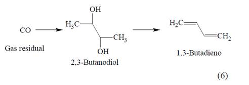 Por otra parte, es posible obtener BD a partir de monóxido de carbono (Ec.6) [16]. Múltiples colaboraciones de empresas biotecnológicas y químicas están combinando ingeniería genética y la tecnología de fermentación con experiencia en catálisis y la ingeniería de procesos. Ejemplos de tales asociaciones son Genomatica y Versalis [17], Global Bioenergies y Synthos [18] e Invista y LanzaTech [19].